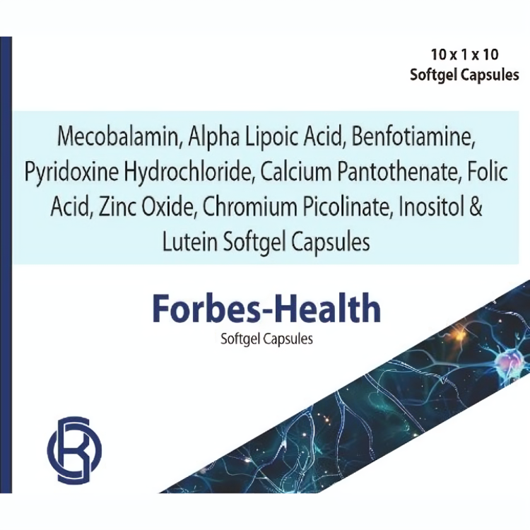 Forbes-Health is a multivitamin softgel that supports nerve health and improves overall vitality. It contains essential nutrients like Mecobalamin, Alpha Lipoic Acid, and Folic Acid.